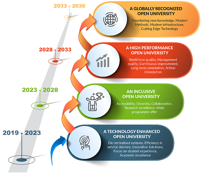 To be an innovative Open University globally recognized for academic excellence, life-long learning and societal impact.
